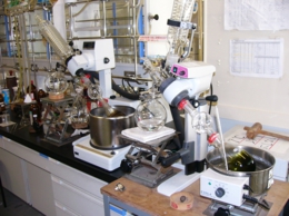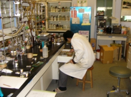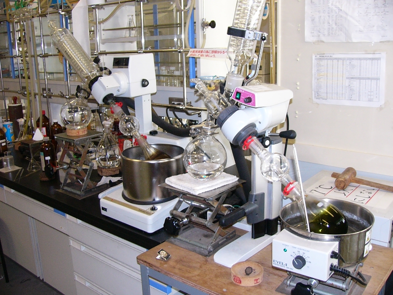 当研究室ではポルフィリンを中心に研究しています。鉄ポルフィリンはヘモグロビンや生体中の様々な酸化酵素の活性中心となっている化合物です。また,クロロフィルはポルフィリンの類似化合物で,光合成の反応中心となる化合物です。研究室のテーマを簡単に言うと,「機能-構造相関」の研究です。その機能は,生体機能の模倣系 "Biomimetics(生体に学び,生体を超える)" により実現しようと考えています。機能の中心は,酸素の活性化と光エネルギーの利用です。今は,ストップしていますが光合成の模倣系による太陽電池の開発も行っていました。(チャンスがあれば再起動するつもりです。)